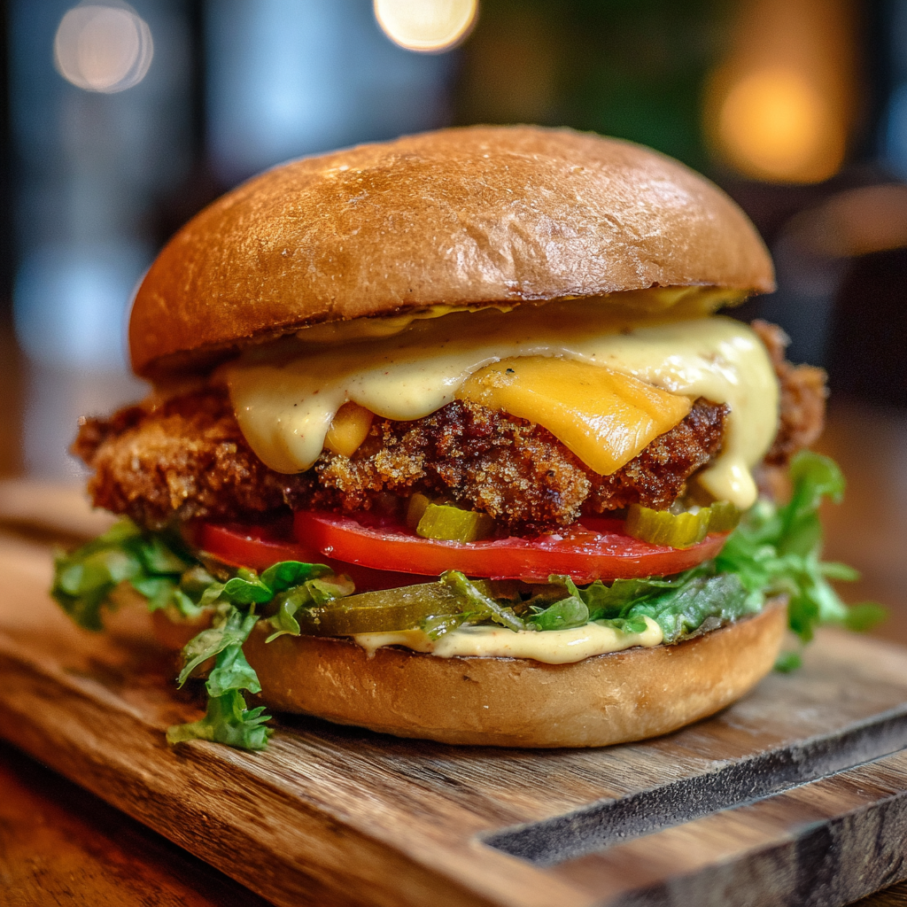 Fried chicken done the right way — golden, crispy, juicy. Stacked with melted cheese, zesty Clayton sauce, mustard mayo, crisp lettuce, fresh tomato, and crunchy pickles. It’s the OG, the standard, the taste that started it all.