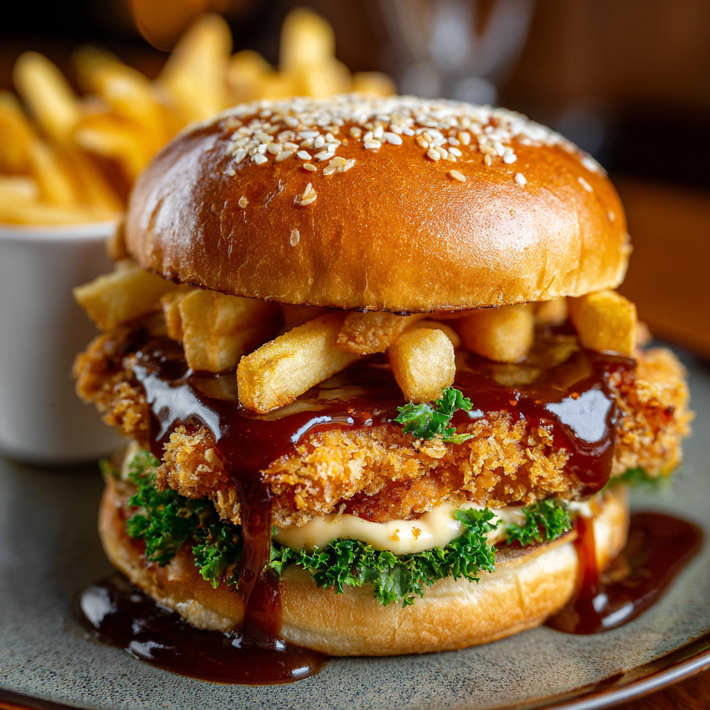 A proper schnitty sandwich — golden-crumbed chicken schnitzel, slathered in rich, creamy aioli, and stuffed with a cheeky handful of gravy-soaked chippies. It’s comfort food with a bad attitude.