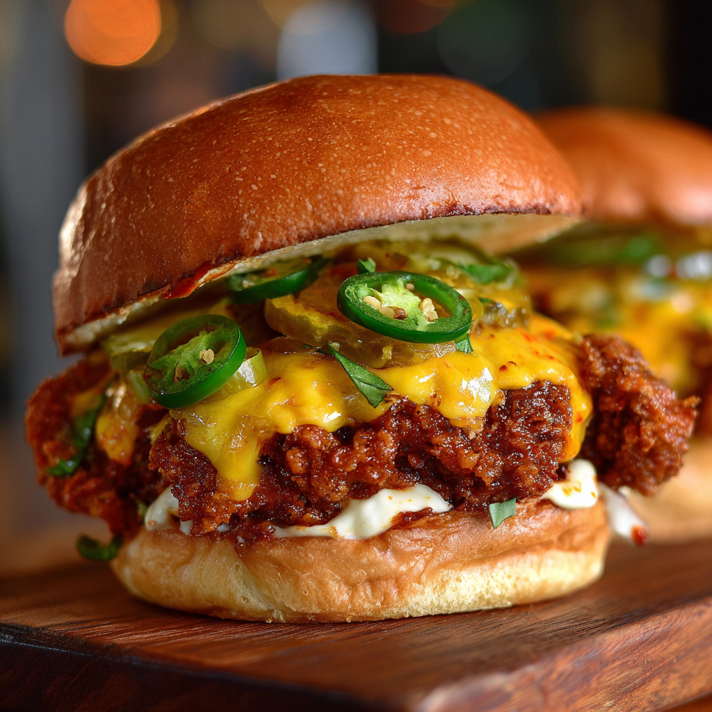 Crispy fried chicken bringing the crunch, smothered in sriracha mayo for a fiery kick, layered with molten cheese and a tangle of jalapenos. It’s bold, brash, and guaranteed to blow up your taste buds.